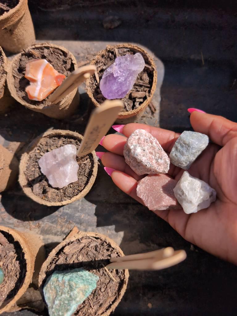 Amethyst, Black Tourmaline, Carnelian, Citrine, Clear Quartz, Fluorite, Green Aventurine, Green Calcite, Labradorite, Moonstone, Orange Calcite, Pyrite, Red Jasper, Rose Quartz, Sodalite, Sunstone, Tiger Eye, Yellow Calcite