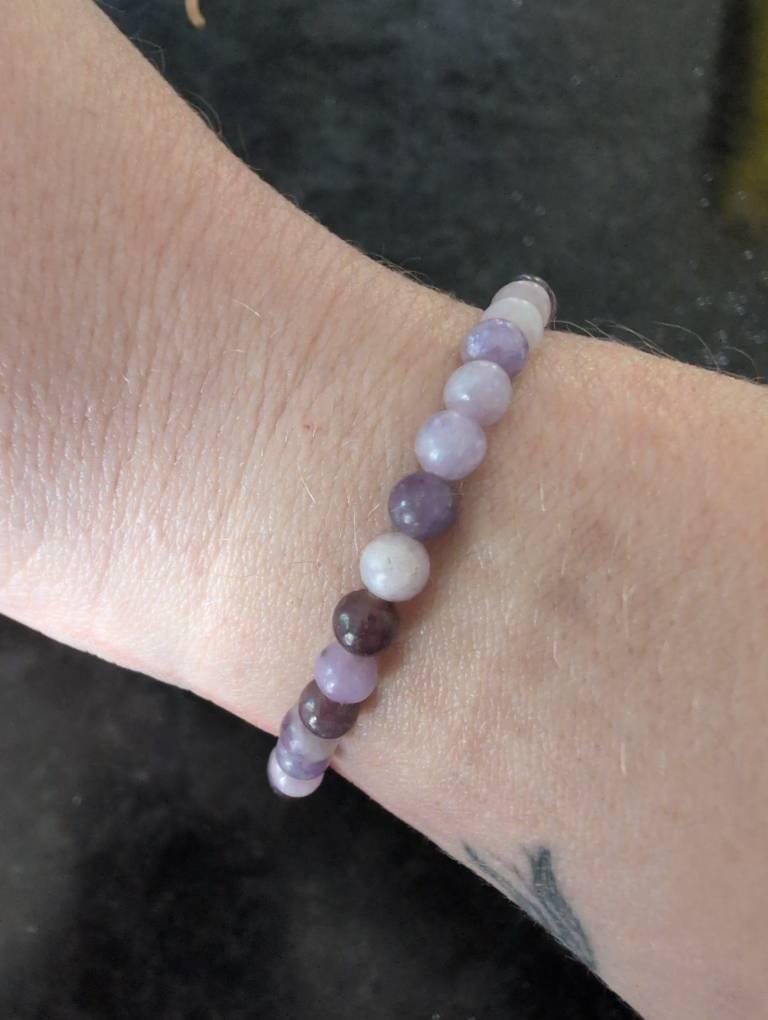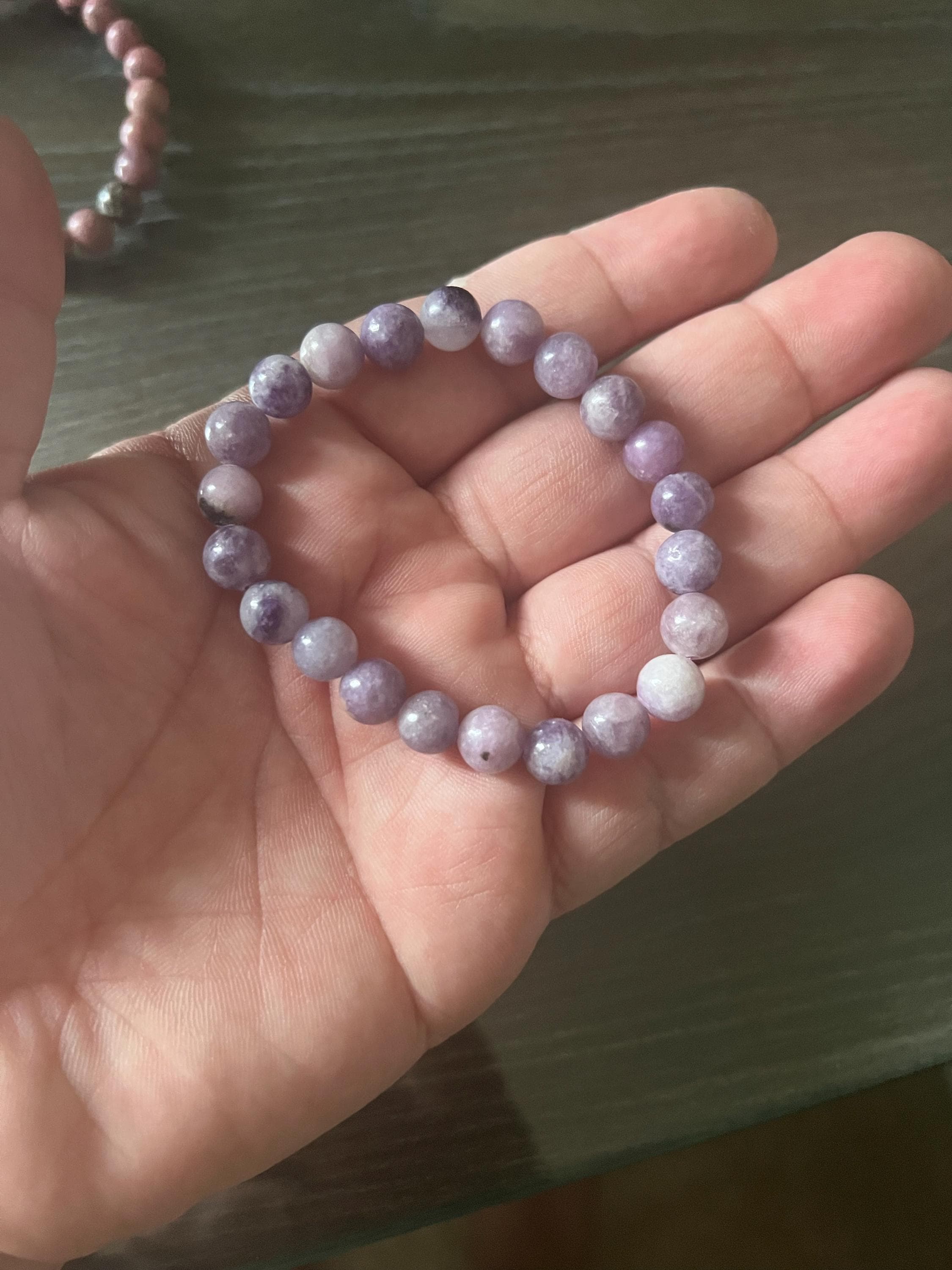 This lovely Lepidolite gemstone bracelet, made with 100% natural crystals, is available in 4mm, 6mm & 8mm round bead options. Choose your desired bead size from the drop down menu. This piece will fit all standard wrist sizes 5 1/2 - 7 inches and is made with a durable heavy-duty elastic cord.
