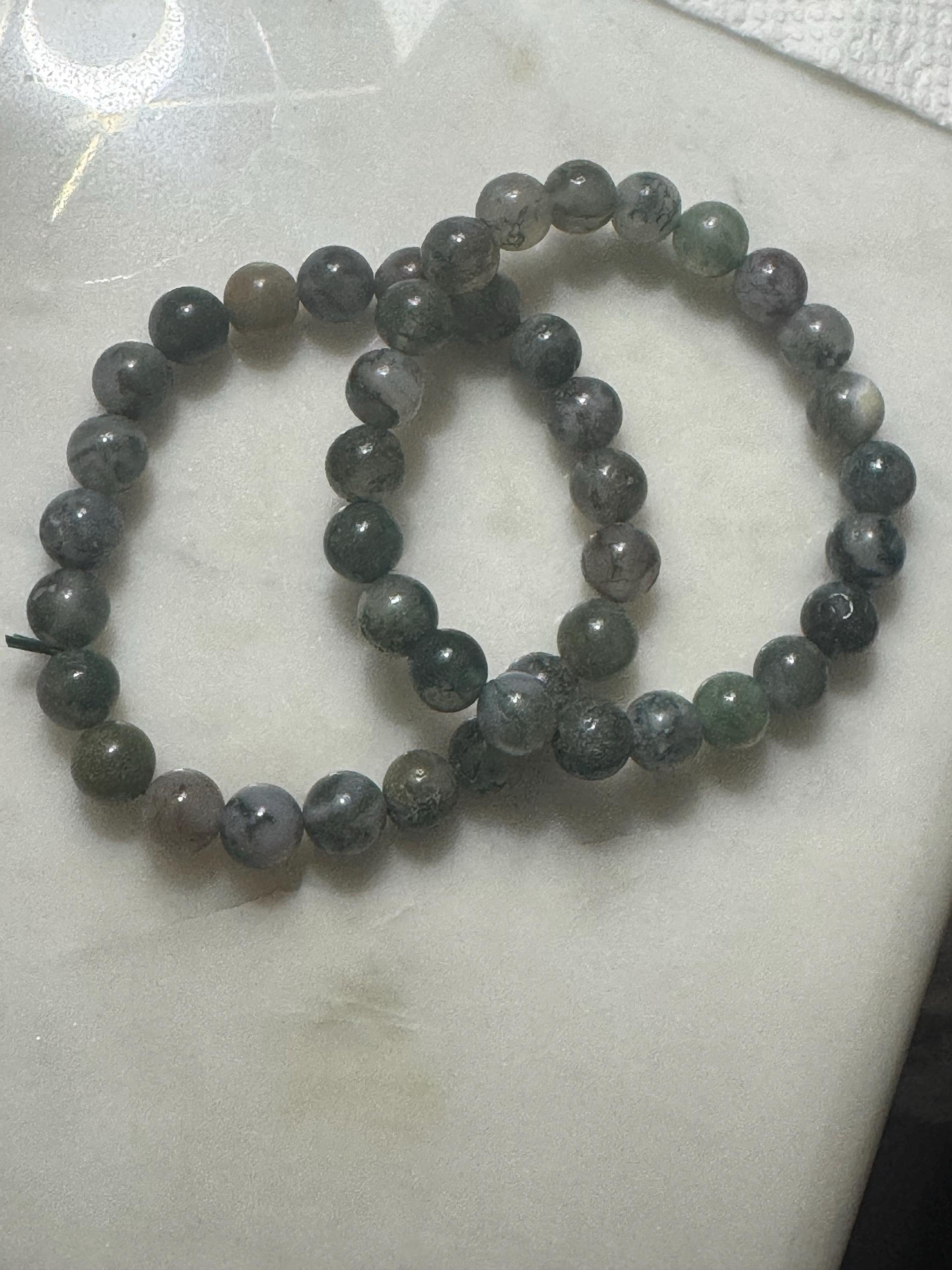 This lovely Moss Agate gemstone bracelet, made with 100% natural crystals, is available in 4mm, 6mm & 8mm round bead options. Choose your desired bead size from the drop down menu. This piece will fit all standard wrist sizes 5 1/2 - 7 inches and is made with a durable heavy-duty elastic cord.
