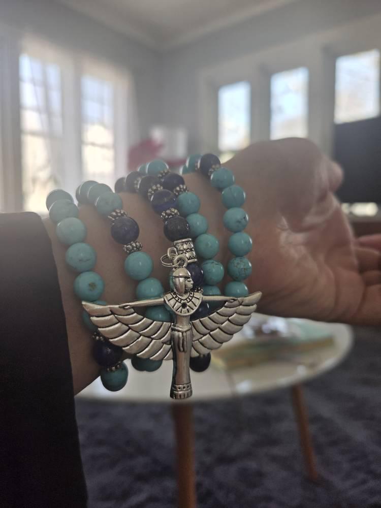 This premium 108 bead 36" mala is made of Lapis Lazuli & Turquoise Howlite and stunning 2" charm of the Egyptian goddess, Isis. Accented with pewter spacers.