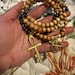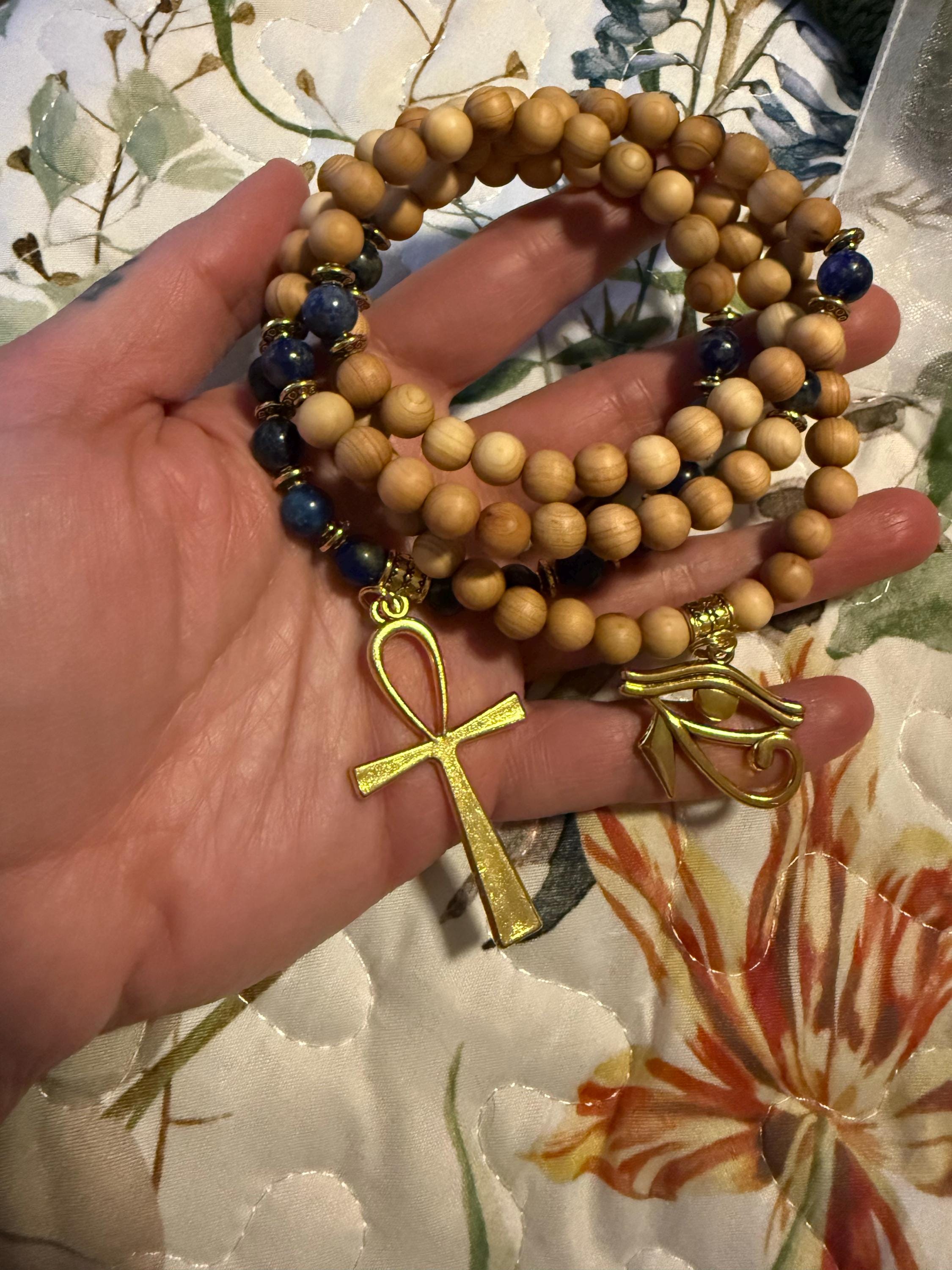 This 108 bead mala necklace is made of Rosewood & Lapis Lazuli with a 2" antique gold ankh cross.