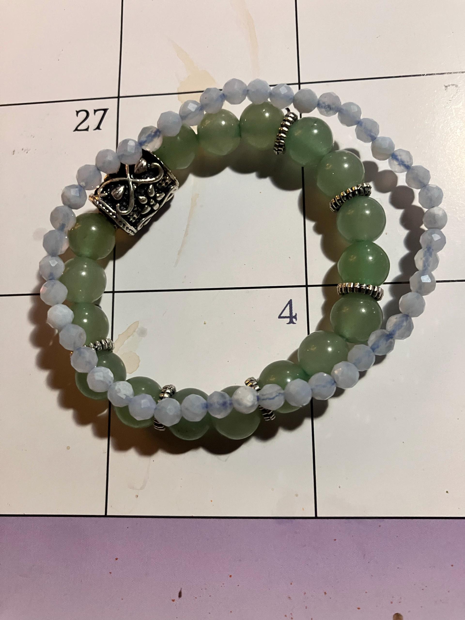 The blue lace agate bracelet was tiny beads, I asked the seller to resize it to 5.5” and she refused, lied to me and said it will fit although the ad said fits 5.5” to 7” wrist, when I received it was way too big, I had to cut it myself and try to know it back and I did a clumsy job all because the seller was too lazy to resize it.
