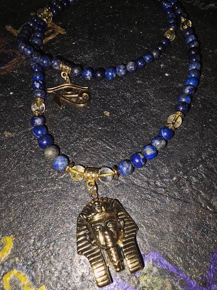 The 2" antique gold pendant represents a Pharaoh or Egyptian King.