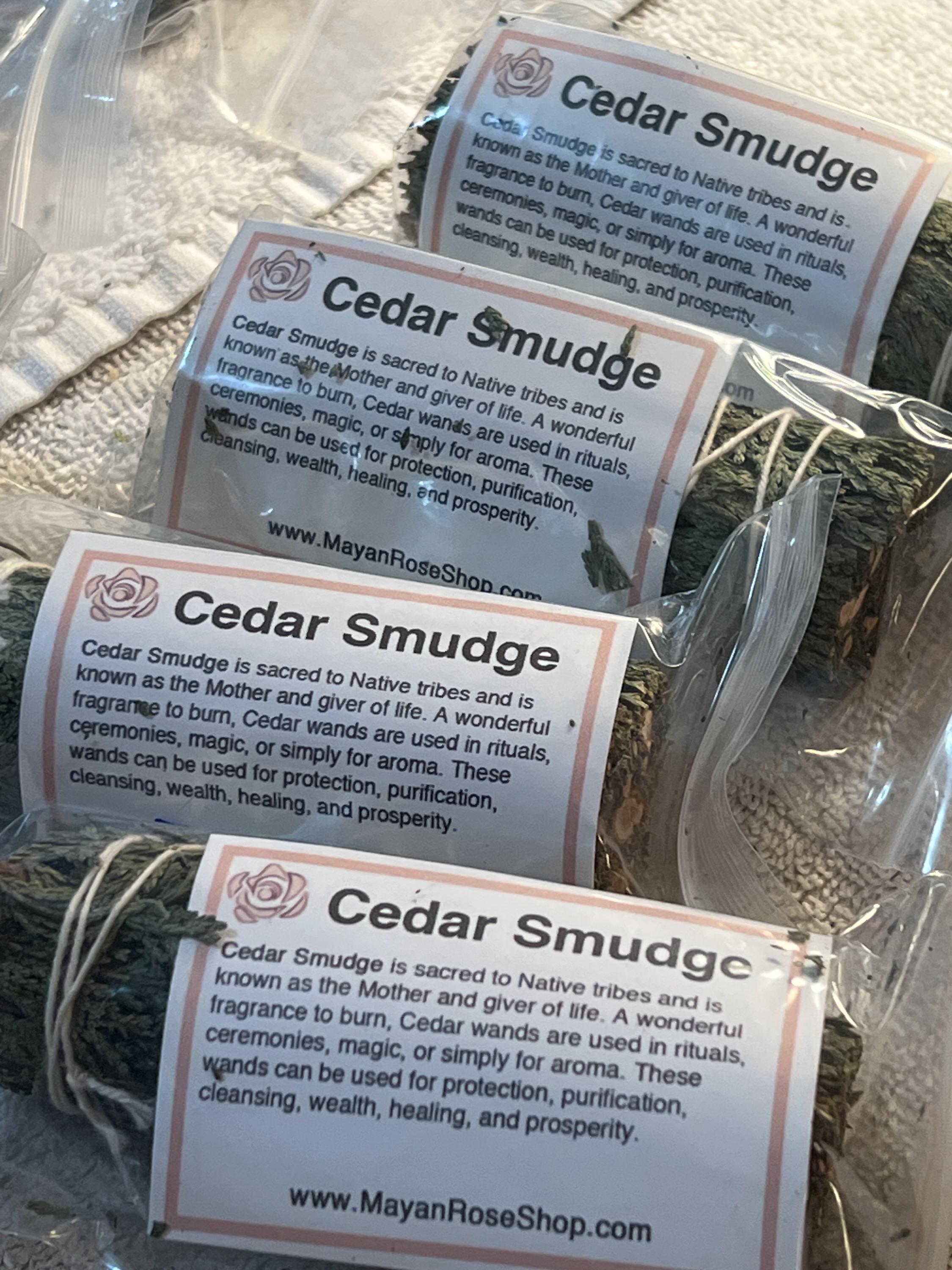 CEDAR SAGE is a sacred herb known as the Mother and giver of life. A wonderful fragrance to burn, cedar wands are used in ceremonies or simply for aroma. These wands can be used for protection, purification, cleansing, wealth, healing, and prosperity.