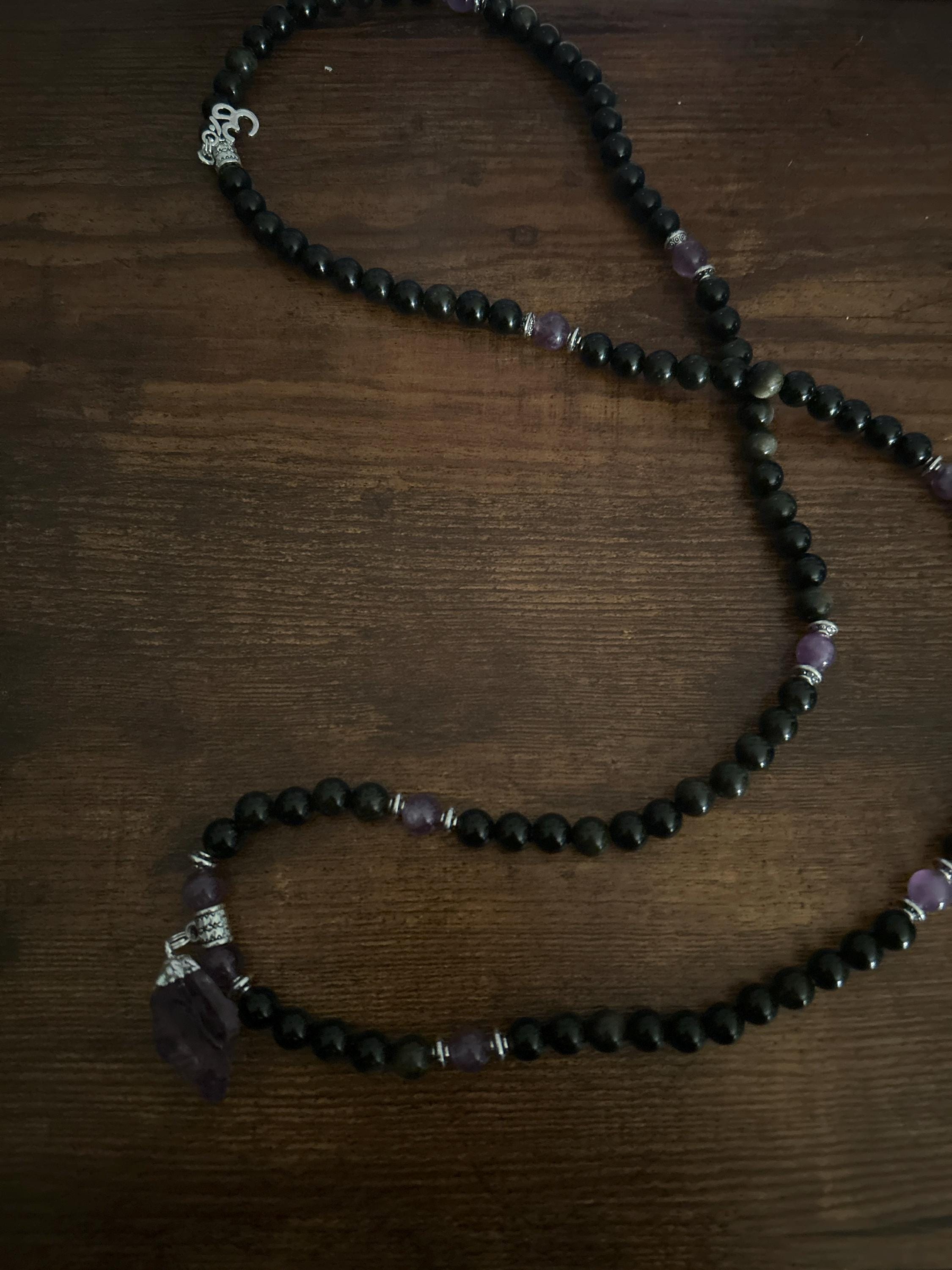 This premium 108 bead mala is made of all-natural 8mm OBSIDIAN & AMETHYST beads and is accented with a 1" RAW AMETHYST pendant. Total Length: 36"