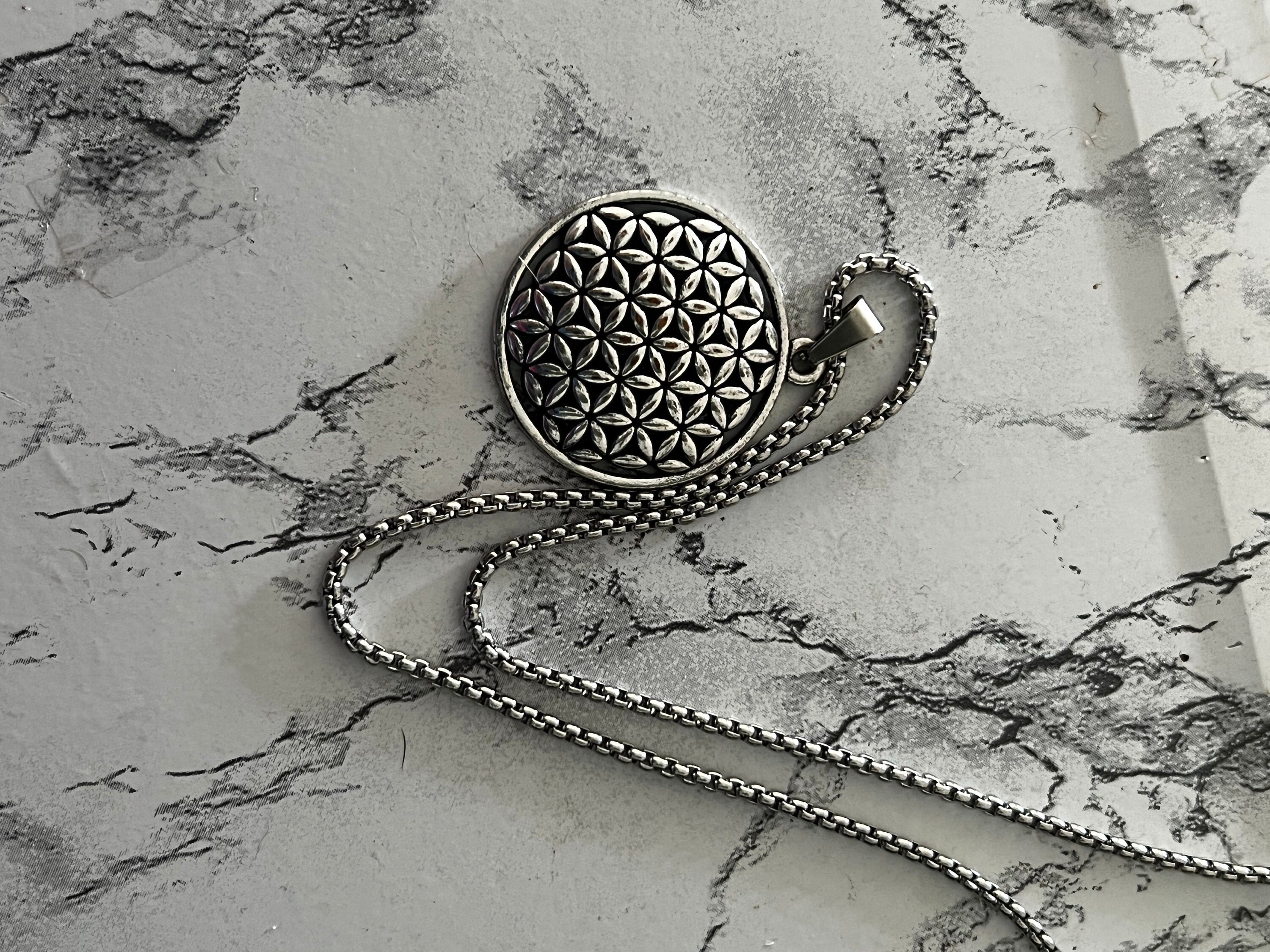 This unisex necklace honors the sacred symbol of the Flower of Life, a sacred geometry symbol representing the universal connection of all things. This universal symbol is believed to represent the cycle of creation, depicts how all life comes from one singular source which is represented by the circle in the middle of the pattern.